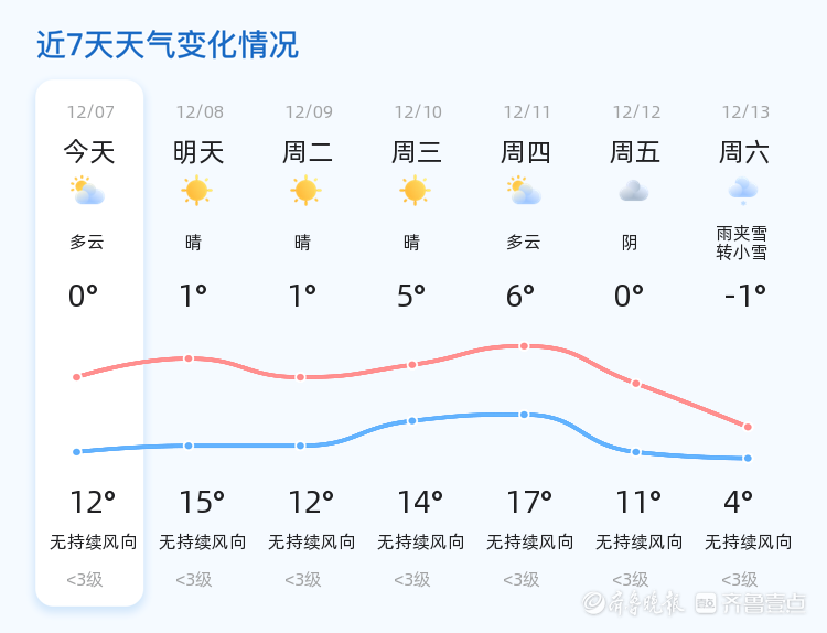 今天是12月7日,星期日,农历十月十八,济南市迎来大雪节气。今日天气多云转晴,气温在0℃至12℃之间,西南风1级,空气湿度35%,PM2.5指数为104,属于轻度污染。大雪节气标志着天气渐冷,降雪开始增多,市民需注意防寒保暖,预防呼吸道疾病。各区天气情况总体平稳,多云转晴为主,气温略有波动。